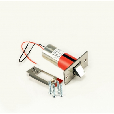 При снятии напряжения питания (для нормально открытого замка) или подачи напряжения питания (для нормально закрытого замка), язычок замка разблокируется, и, при открытии двери, «складывается» в корпус замка: