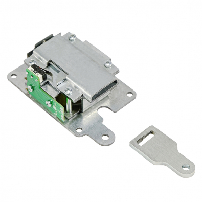 Нормально закрытый (открывается подачей напряжения), напряжение питания 24 В, встроенные датчики состояния замка |